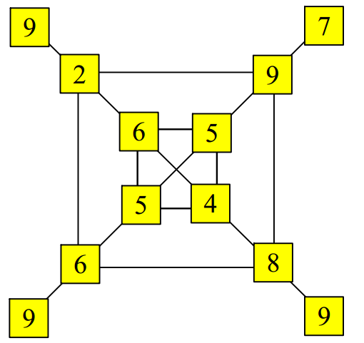 Cho bản đồ như hình dưới đây, mỗi đỉnh là một thành phố, Cạnh nối hai đỉnh là đường đi nối hai thành phố tương ứng. Hè này bố mẹ cho bạn An đi thăm quan. An đã cho điểm mỗi thành phố (điểm số chỉ mức độ ưu thích của An) và được ghi như trên bản đồ. Bạn hãy chỉ cho An và gia đình tua du lịch đi qua 5 thành phố liên tiếp nhau sao cho tổng số điểm là lớn nhất.