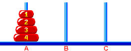 Trong bài toán đố tuần trước (nhấp vào đây để xem), thực ra số đĩa cần chuyển không phải là 3 đĩa, mà Vị Hoàng đế đã không cho biết số đĩa trên tháp A ban đầu là bao nhiêu. Toán đố tuần này yêu cầu bạn phải đưa ra lời giải khi muốn chuyển 4 đĩa từ trục A sang trục C như hình vẽ dưới đây, trong đó được phép sử dụng trục B làm trục trung chuyển. Bài toán cụ thể như sau: