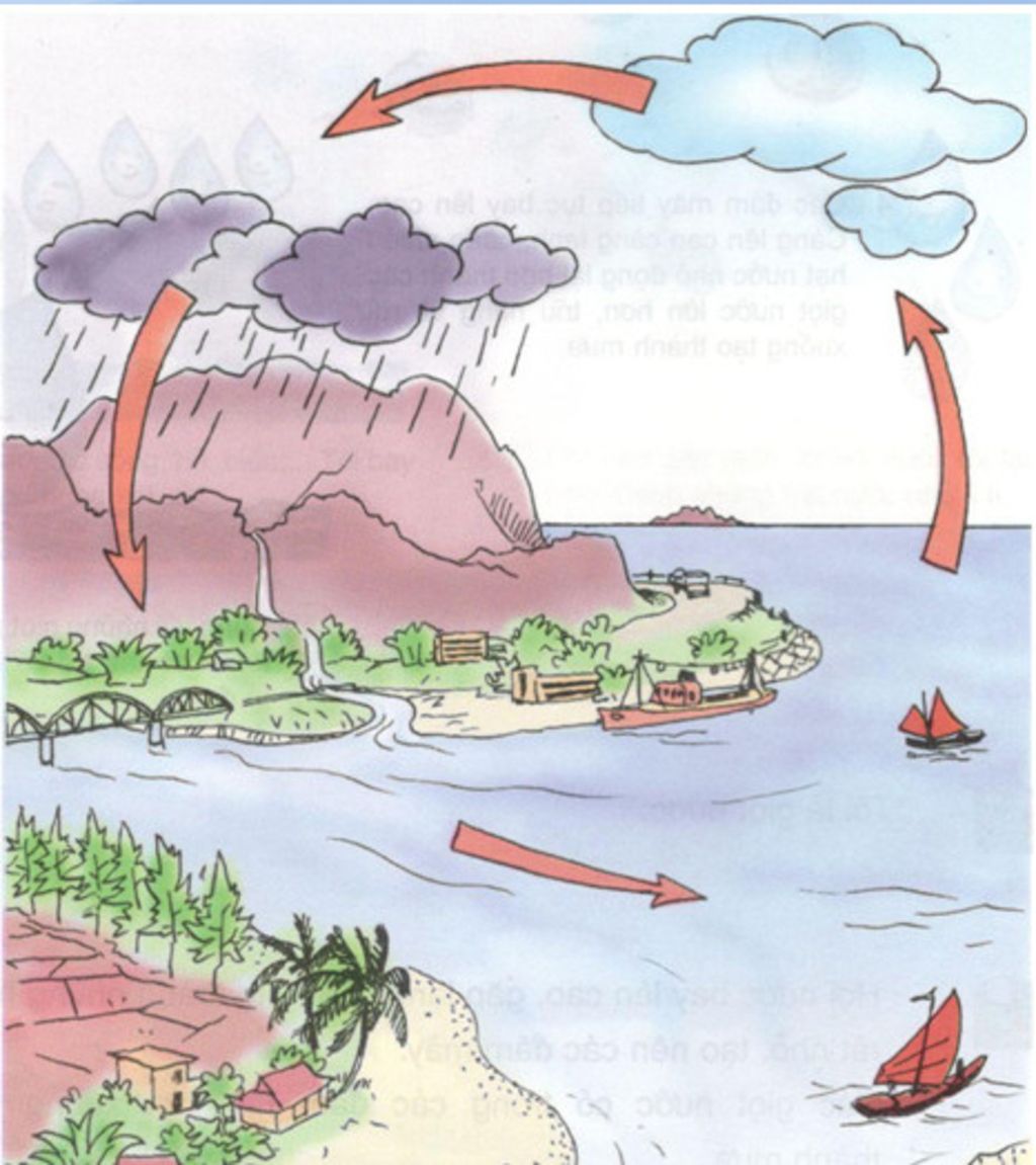 Quá trình hình thành mây mưa: khi không khí bốc lên cao, bị lạnh dần, hơi nước sẽ ngưng tụ thành những hạt nước nhỏ, tạo thành mây. Gặp điều kiện thuận lợi, hơi nước tiếp tục ngưng tụ, làm các hạt nước to dần, rồi rơi xuống đất thành mưa
