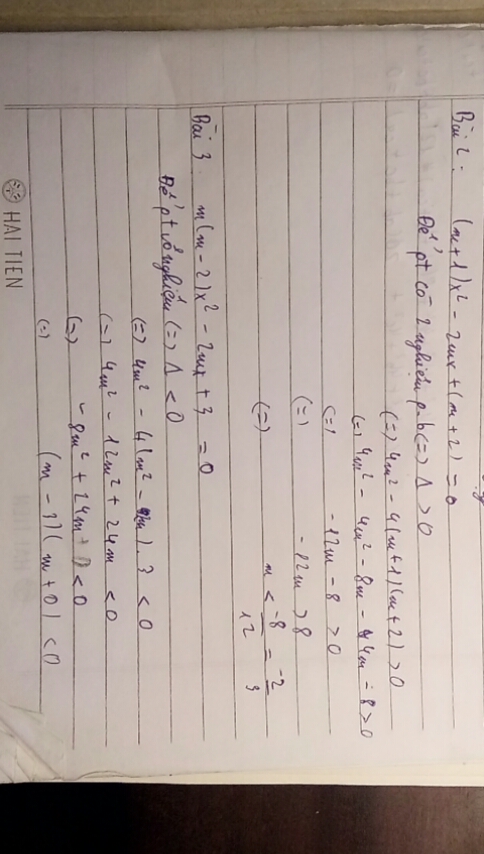 Vì △ < 0 => -8m2 + 24m < 0 <=> -8(m2 - 3m) < 0 <=> m2 - 3m < 0 <=> m(m - 3) < 0